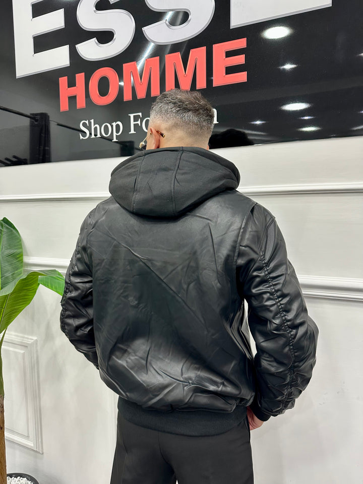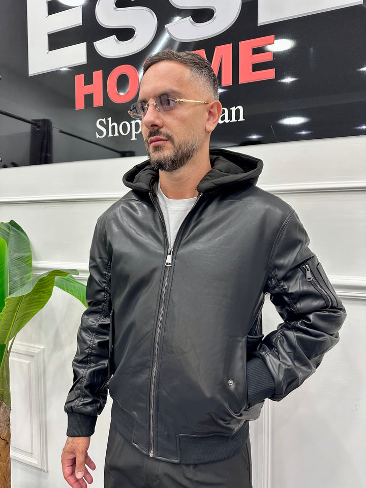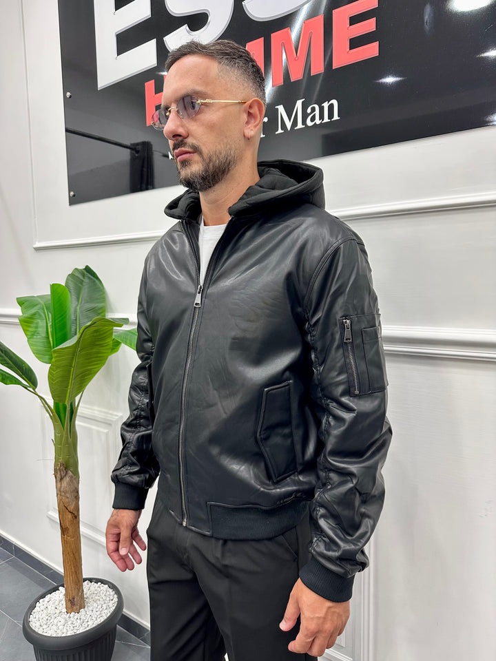 BOMBER CON CAPPUCCIO REMOVIBILE TASCHINO LATERALE E MANICA DRAPPEGGIATA IN TESSUTO ECOPELLE