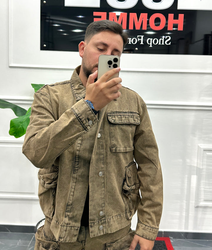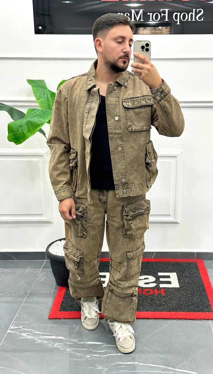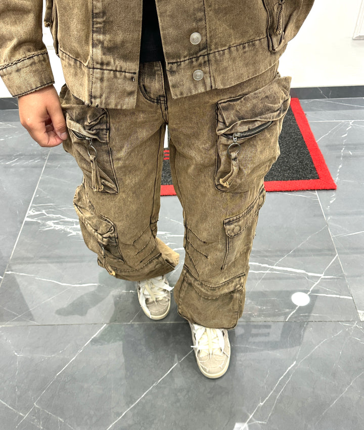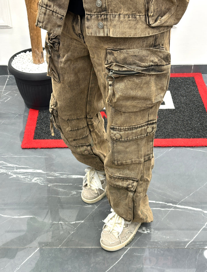 Coordinato in jeans sabbiato composto da un giubbino con tasconi e pantalone cargo