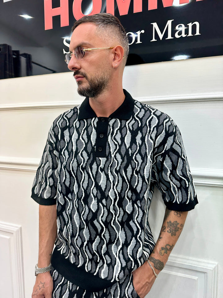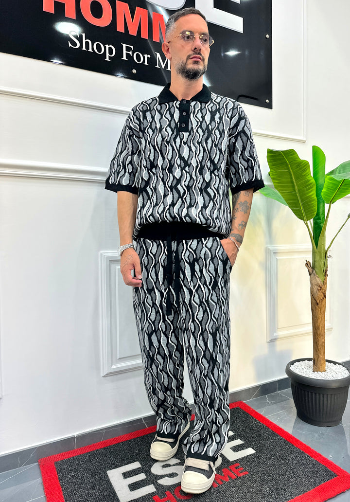 COORDINATO IN MISTO LANA COMPOSTO DA PANTAKINEVFONDO AMPIO E MAGLIA POLO IN BOTTONI CENTRALI