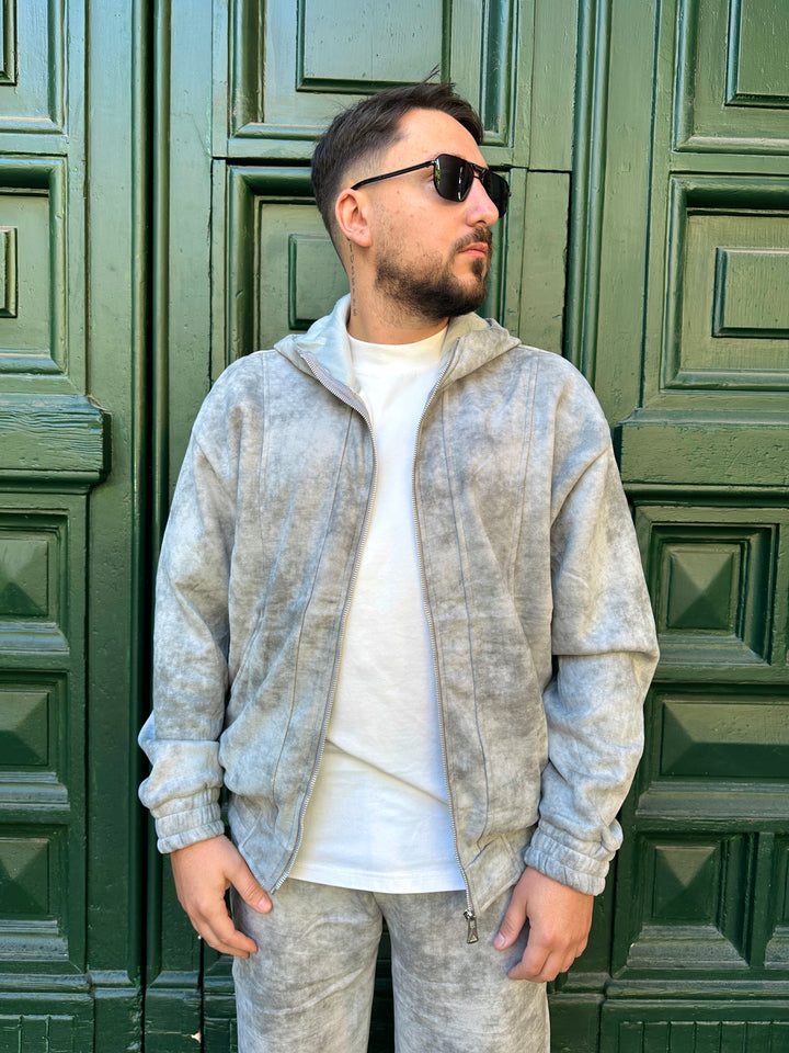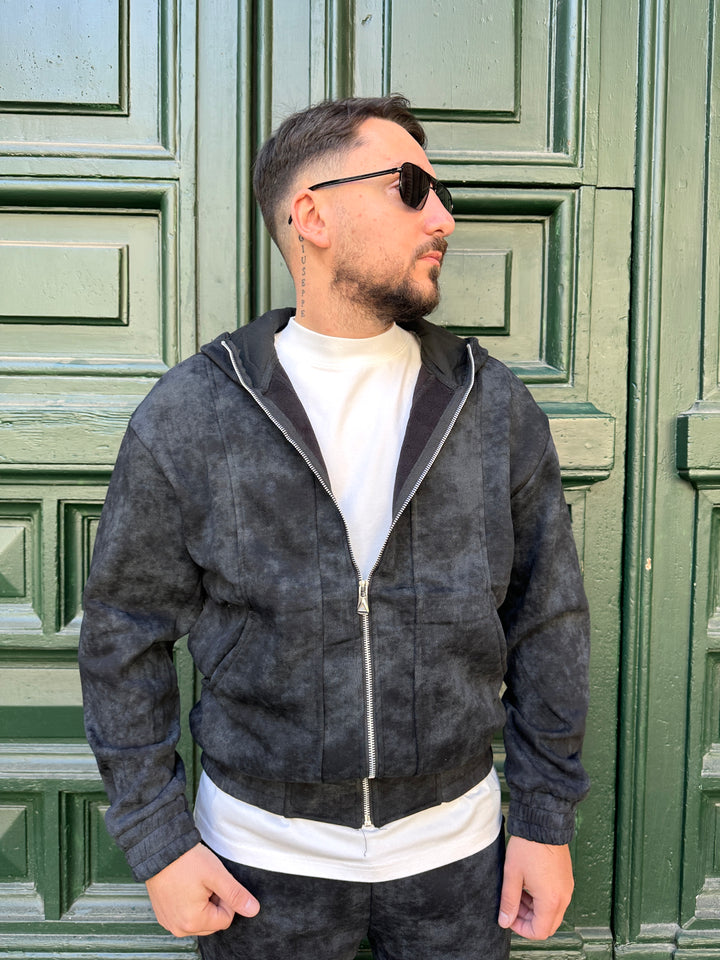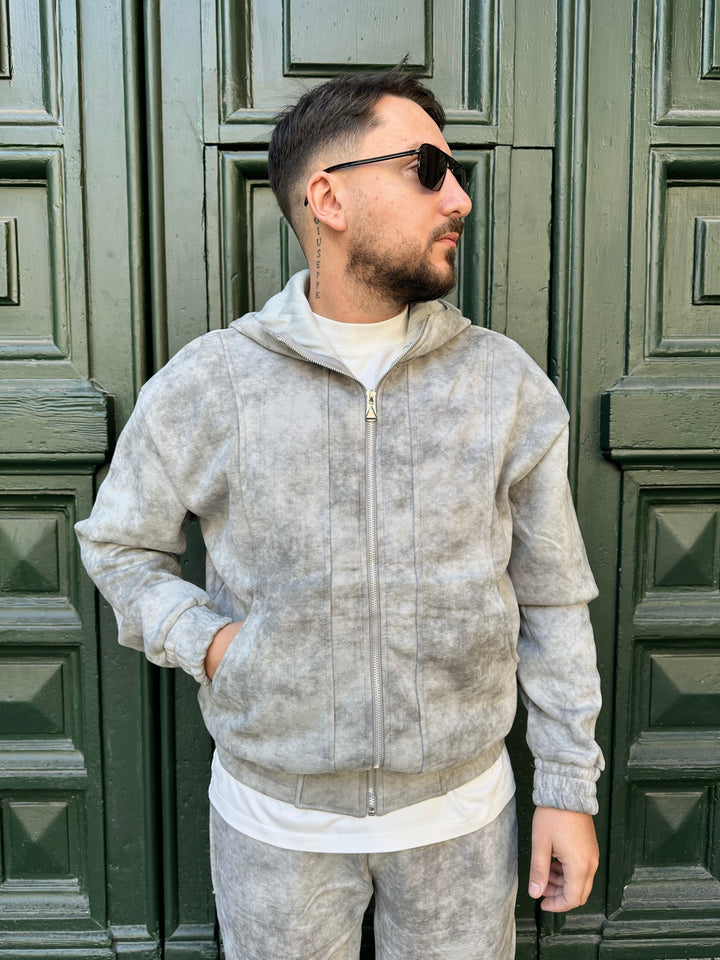 Coordinato tessuto tuta con pantalone fondo largo e felpa boxy fit. Interno pile