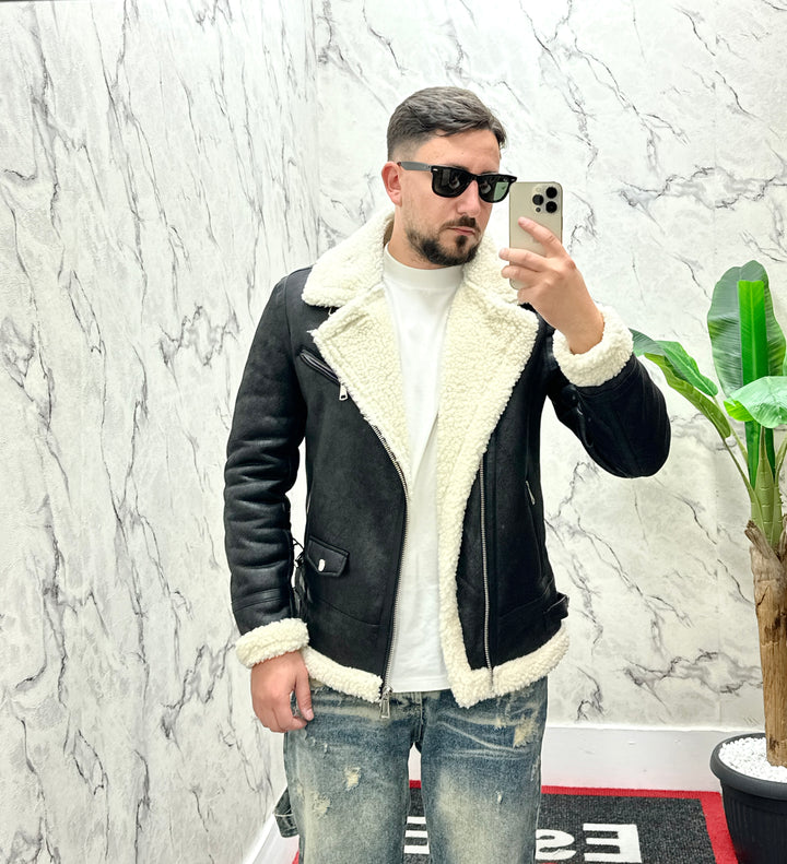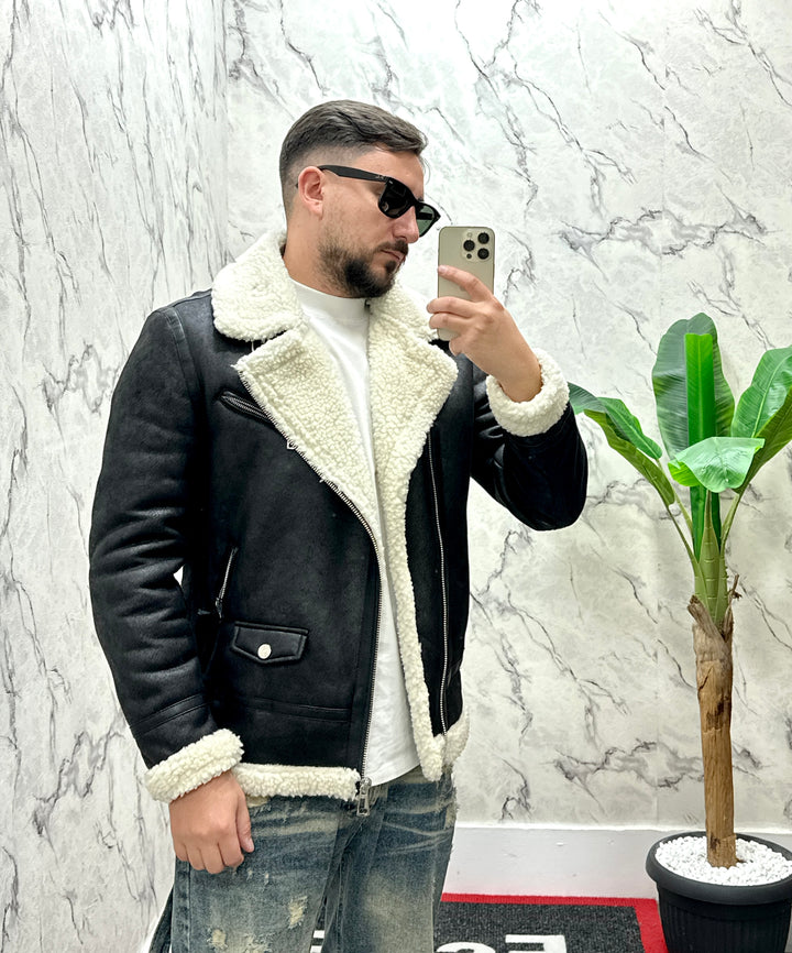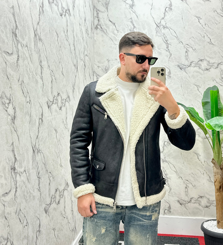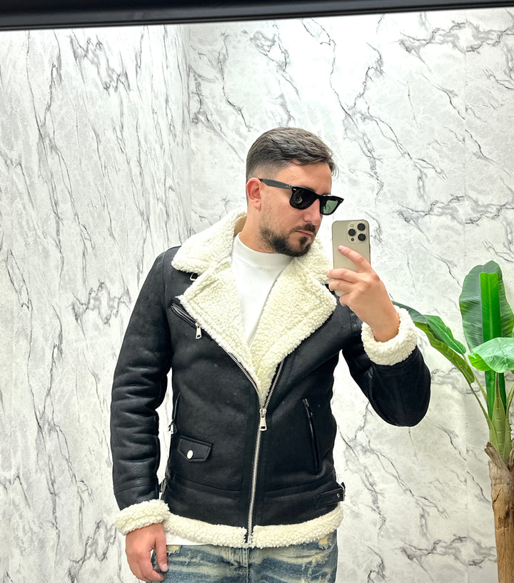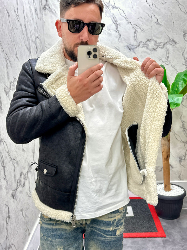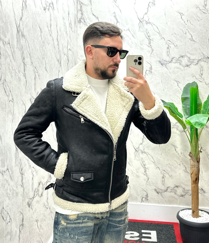 Ecomontone con abbottonatura laterale esterno ecopelle nera interno ecopellicciq bianca