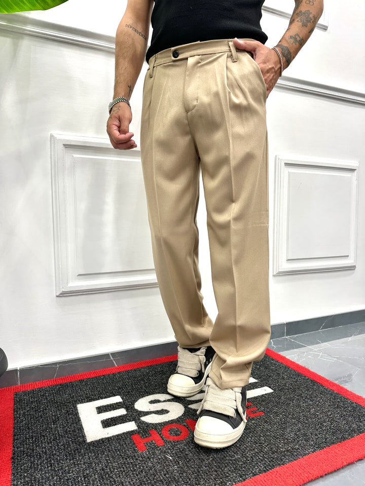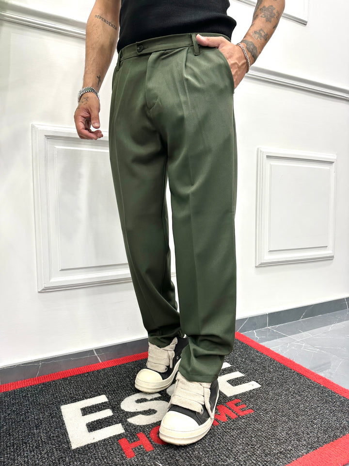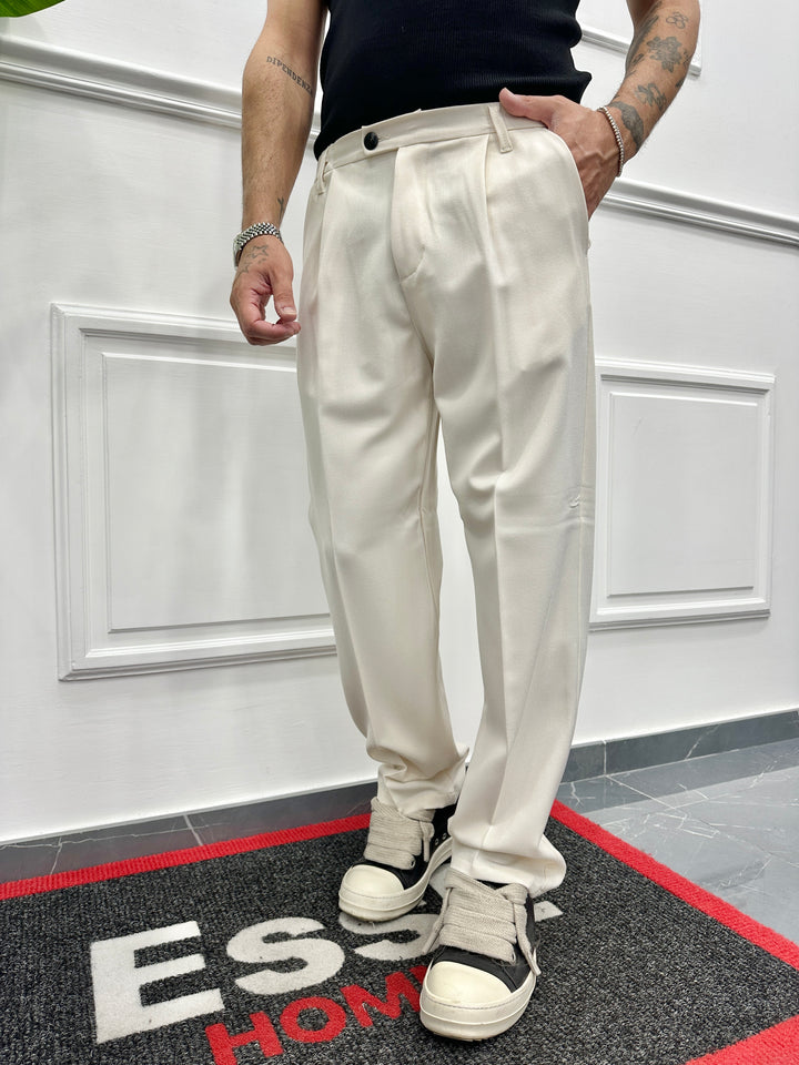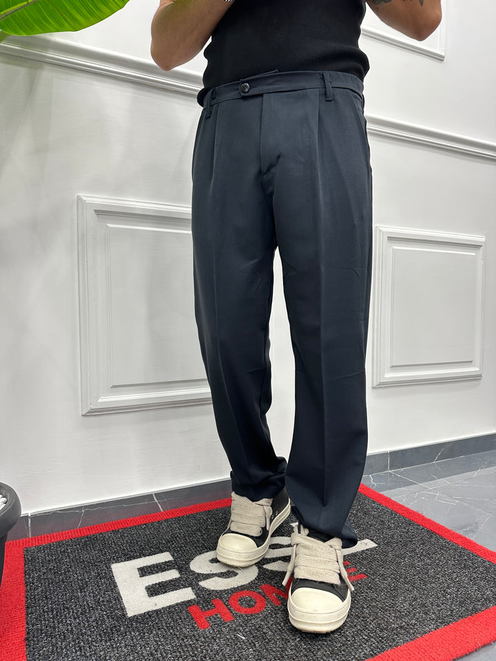 Pantalone con abbottonatura laterale ed elastico in vita. Vestibilità comoda con fondo largo