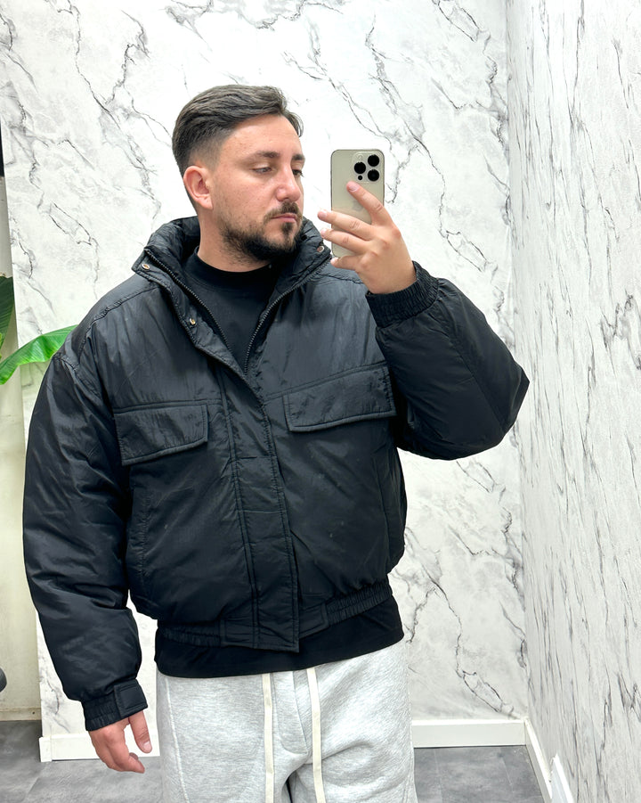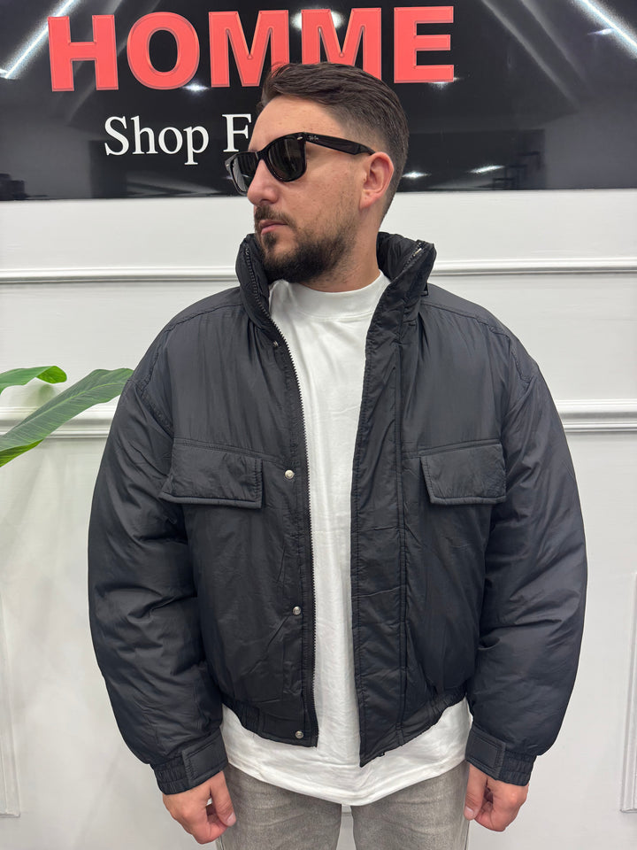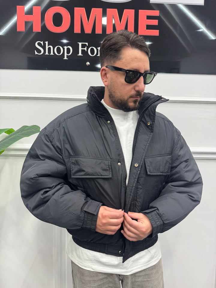 Piumino crop fit con tasconi sul petto e tasche laterali, cappuccio estraibile