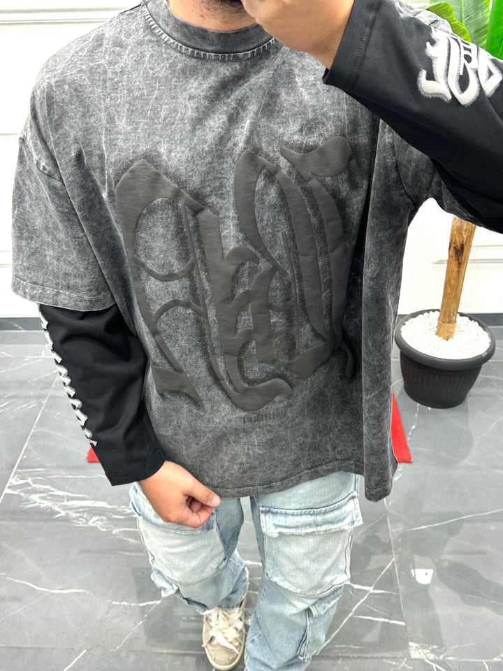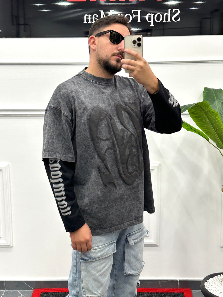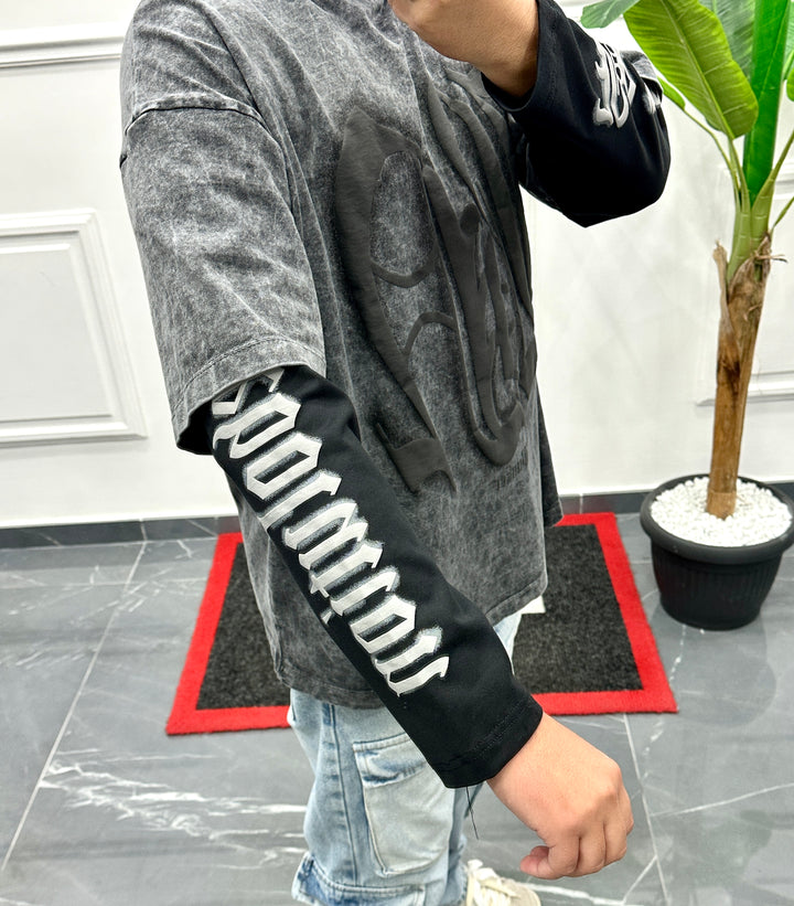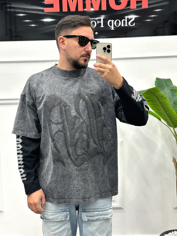 Shirt con doppia manica lavaggio candeggiato stampa frontale e sulle braccia